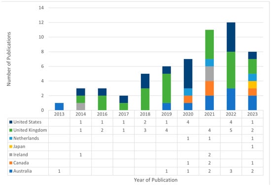 The 58 articles that met the inclusion criteria for this research have high-quality content for the subsequent thematic analysis and are listed in Table 2. Each publication was categorised according to the geographical location of the first author’s institution and year of publication to provide a scenario overview of publications on the topic (Figure 2). Upon classifying the papers based on their years of publication and countries of origin, a discernible pattern emerged, indicating an increasing trend in the number of publications pertaining to the subject matter across various nations. The geographic analysis revealed that in the last decade, BTR publications were more common in the UK, followed by the United States and Australia. The analysis indicated that in the last three years, there has been increased interest in research into BTR-related topics in the UK and Australia, possibly due to the significant growth in rental housing demand and the BTR sector in those years.