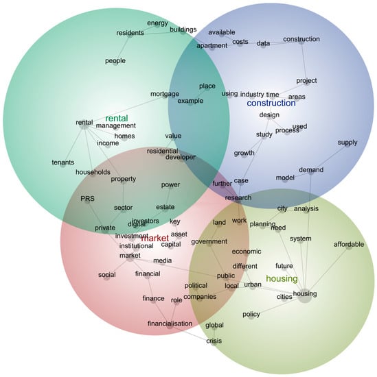 The overarching topic of “housing” encompasses various subtopics, such as crisis, affordability, planning, and policy. The concepts of crisis, policy, and public all discuss issues and changes that have played an important role in the growth of the PRS and BTR. Mortgage supply contractions, price increases, and the lack of housing supply have led to the increase in the rental sector in the past decades [,,,,,]. These changes in the housing market have resulted in the “generation rent” trend [], in which people rent for increasingly longer periods of time as they are not able to afford to purchase a property. Moreover, there are examples of countries where living in rental properties long term has already become the standard way of living. The increase in PRS and the overall rental demand has led to a rise in interest and curiosity about the BTR market.