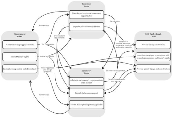 Based on the previous analysis, this research identifies key stakeholders and identifies strategies to be adopted by each stakeholder with the objective of achieving successful BTR developments. The government is an important stakeholder and holds responsibility for its citizens’ housing and as such, is directly engaged in the success of BTR developments. To start with, governments are responsible for the housing needs of their populations and must address high demand issues. As public capital cannot deal with this ongoing problem itself, this responsibility becomes one of facilitating private housing investments [,]. In the UK, government incentives were responsible for the growth of the BTR market. Public incentives, such as financing, the creation of a BTR fund, foreign investment incentives, facilitating office-to-residential conversions, and fast-tracking approvals were implemented by local and federal governments in the UK as a way to minimise risks for investors and developers, leading to exponential growth in the last 10 years [,,]. As seen, concession-focused strategies for BTR developments are of great value in attracting more BTR investment and construction as they minimise risk, reduce the time for a return of the investment, and attract new providers to the BTR market. These can be in the form of reducing foreign investment taxation, applying tax reductions to BTR developments, and allowing fast-track planning or individual pathways for BTR developments.