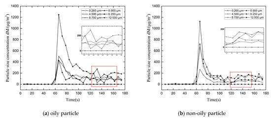 In previous experimental tests [], a research group found that compared with non-oil particles, the effect of sound agglomeration on increasing the particle size of oil particles is more significant. When the initial conditions were the same, oil fine particles with a diameter smaller than 2.5 μm agglomerated into particles with a diameter of 8.75 μm, and their mass concentration was about 1.6-times higher than that of non-oil particles agglomerated into particles of the same size, as shown in Figure 1. This indicates that under the collision and agglomeration effect in the acoustic field, the oil fine particles can form agglomerates, and under the dominant interparticle force (representing the combined acting force of van der Waals force and double-layer repulsion force, which is the main short-range force causing particle agglomeration), the adjacent particles are attracted to each other and adhere to form agglomerates [], making the agglomerates more stable and suppressing their rebound or fragmentation. The experiment also indicated that acoustic agglomeration has a more significant control effect on oily particles and holds tremendous potential for application.