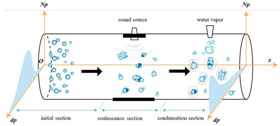 Schematic diagram of the coalescence and growth process of oily fine particles based on acoustic coalescence combined with water vapor condensation.