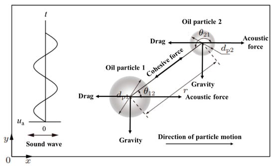 Currently, research on sound agglomeration mainly focuses on investigating the effect of operating parameters, such as sound pressure, sound frequency, particle size distribution, and gas composition, on particle agglomeration through experiments [,]. Additionally, there has been research on the enhanced effect of particle agglomeration under the combined action of sound agglomeration and other mechanisms [,]. However, there is relatively little research on the mutual motion and mechanism of oil fine particles in sound agglomeration. Sound agglomeration involves complex phenomena and processes, such as the effects of the sound field on particles, the influence of particle motion on the sound field, and the scattering of sound waves. As a result, there are various mechanisms of the sound field on the mutual motion of particles, with the most widely studied being same-direction interaction and the acoustic wake effect [].