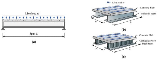 Consider the design of a simply supported steel–concrete composite floor system (Figure 1) with two input parameters: live load ω (ranging from 2 to 10 kN/m2) and span length L (ranging from 20 to 100 m). Two types of designs are considered: steel–concrete composite floors with welded I-sectional steel beams (Case I), and composite floors with corrugated web steel beams (Case II), as shown in Figure 1b and Figure 1c, respectively.