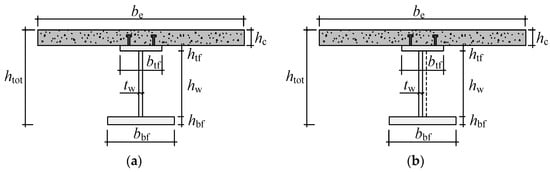 Cross-sections of the studied composite beams: (a) composite beam with welded I-section; (b) composite beam with corrugated web.