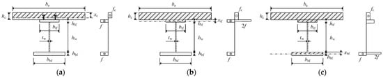 Steel–concrete composite floors for optimization: (a) simply supported steel–concrete composite beam; (b) composite floor with welded I-beams; (c) composite floor with corrugated web beams.