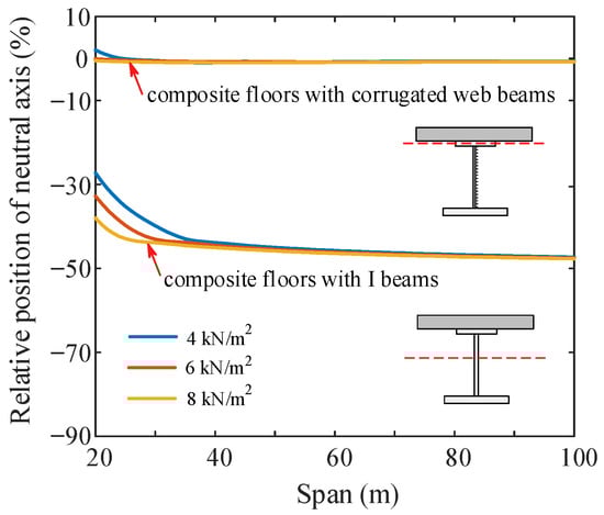The optimization results demonstrate the similar features and specific differences for the optimal cross-sections of the two studied composite floor systems. It can be seen from Table 1 and Table 2 that the optimized steel sections are unanimously subjected to the width-to-thickness ratio to acquire higher flexural resistance with minimum material, which reconciles with the engineering cognition. Noting that the corrugation of the steel web makes a significant difference to the sectional dimensions, the thicknesses of corrugated webs are considerably thinner than those of flat webs in I-beams. The optimized examples show that the more effective way to increase flexural resistance in the composite I-beam is to make more use of the bottom flange rather than enlarging the steel web, whose thickness is subjected to a stricter height-to-thickness ratio. On the contrary, the corrugated web composite beam could easily obtain a more effective flexural resistance by a tall web without much additional steel consumption because the height-to-thickness ratio of the corrugated web is quite large. Consequently, the neutral plastic axes of the optimized sections are distributed differently for the two composite floor systems due to the different sectional developing rules, as shown in Figure 7, in which the position of the plastic axis is measured from the lower interface of the concrete slab. Figure 7 shows that the neutral plastic axes are located in the upper flanges for composite I sections and down in the middle of webs for corrugated web composite sections. With the plastic axis lying near the interface of concrete and steel, the composite floor with corrugated web beams could better realize the composite effect and achieve sufficient material savings.