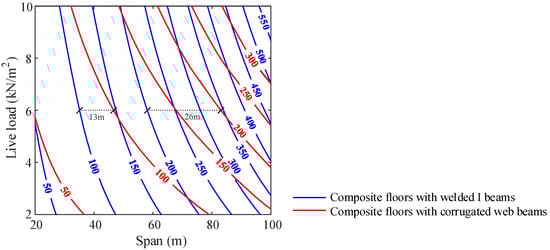 The optimization results of the general steel consumption are presented in the form of isolines in Figure 8 for various combinations of spans and live loads for the discussed composite floor systems. The isolines are drawn at every 50 kg/m2 of the objective function values and each isoline corresponds to multiple design conditions under equal steel consumption. The isolines themselves show that the impacts of design requirements to the studied composite floor systems produce different responses. Every isoline in red presents a more apparent degree of curvature, thus, a wider range of spans is economically permitted. This means that the composite floor system with corrugated web beams could be extensively applicable with proper material consumption. The distribution of the isolines also reflects the economical efficiencies of the two composite floor systems. It can be seen that the red isolines associated with composite floors with corrugated web beams are distributed less densely than the blue ones, which means the general steel consumption of composite floors with corrugated web beams increases more slowly than that of composite floors with welded I-beams, indicating the leading advantage in economic competitiveness for composite floor systems with corrugated web beams. In addition, the cost-effectiveness of composite floors with corrugated web beams further increases with the rise of the span. Taking the design condition of a live load of 6 kN/m2 for example, the economically optimal span of the composite floor with corrugated web beams exceeds the composite floor with I-beams by 13 m at an equivalent general steel consumption of 100 kg/m2 and 26 m at a steel consumption of 200 kg/m2, at which the permitted span of the composite floor with corrugated web beams achieves over 80 m.