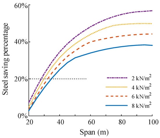 In order to illustrate the steel-saving effect of the composite floor with corrugated web beams, the steel-saving percentages are presented in Figure 9 by comparing the optimal steel consumption required for the two floor systems under the same design conditions. Figure 9 shows that the utilization of composite floors with corrugated web beams yields significant steel savings, ranging from 20% to 60% for large spans. Therefore, composite floors with corrugated web beams are recommended for use in large-span floor systems. Nevertheless, considering the convenience and lower construction and maintenance costs, the composite floor with I-beams can be recommended for spans that are less than 30 m, at which the steel-saving percentage rests at a relatively lower level of 20%.
