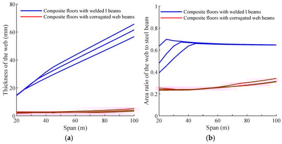 The significant economical efficiency of using composite floors with corrugated web beams results from the configuration of the steel web. The thickness required for the corrugated steel web is substantially less than that for the flat web, as shown in Figure 10a, which results in a great reduction in steel consumption of the web. Figure 10b illustrates the area ratio of the web section to the whole steel cross-section for the two floor systems. It is shown that the proportions of the corrugated webs steadily grow from a ratio of 0.2 to 0.3, while the proportions of the flat webs in I-beams rise rapidly to 0.7 at the span of 40 m and remain relatively constant thereafter.