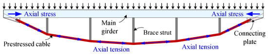 Based on the previous results and discussions, an effective way for designing a super-large-span composite floor system is to enhance the flexural-resistant efficiency and to decrease the steel proportion of the web that has relatively lower flexural bearing efficiency. Considering such a design concept, a new cable-supported steel–concrete composite floor system is recommended by the authors. This structural form is developed from the string beam structure [] as shown in Figure 11, which simplifies the web form and receive sectional depth from struts that connect the compressed main girder and the prestressed cable. The stress in the girder and tension in the cable act together to significantly resist vertical loads. The structural configuration and high-bearing efficiency of the string beam contribute to its simple and elegant appearance, and has provided great economic benefits in the applications of large-span roof structures [,,].
