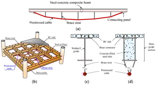 To effectively utilize the string beam in large-span floor structures, the key approach is to incorporate concrete into the main girder that is subjected to compression. Figure 12a,b show the cable-supported beam and floor system with traditional steel–concrete girder, which have been used in bridge and roof structures and received good benefits [,,]. Figure 12d presents a novel cross-section design for the cable-supported steel-concrete composite beam, which utilizes concrete-filled steel tube (CFST) in the main girder cross-section. Compared with the beam using traditional composite girder in Figure 12c, the beam with composite girder using CFST could greatly enhance its resistance to axial compression and negative bending moment, while also avoiding the probable stability issues caused by the prestressed I-girder. Therefore, the design of the cable-supported composite beam as shown in Figure 12d can adopt larger cable cross-sectional area and initial prestress, thereby significantly improving the bearing capacity and applicable span of the cable-supported composite beam.