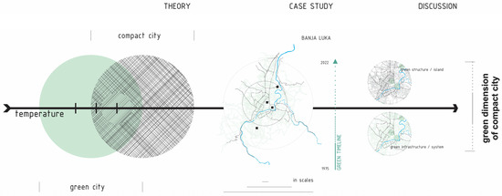 This paper examines the relationship between the development of a compact city and its green dimension and how such development, by changing the green structure, actually changes the city’s climate. In the example of Banja Luka in site-specific conditions, in parallel, green structure changes and temperature changes for the entire city in the last fifty years are monitored, while detail analysis is on three scales: the wider urban area, the narrower urban area, and the largest park in the city center. The focus is on large urban green structures—parks with an area equal to or larger than 1 ha, as a green structure, have an influence on the city’s climate; the temperature values were measured during one year within four of these green urban parks. By analyzing the temperature values inside city parks at different scales of the city, both now and through the previous period, it is possible to recognize the green dimension of Banja Luka as a compact city. The goal is to verify the green dimensions of a compact city by measuring the temperature and how the climate of the city changes from the dimension of green infrastructure—a unique system of interconnected parks—to the dimension of green structure—parks as isolated green islands (Figure 1).