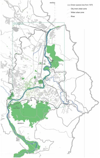 The first and only urban plan of the city of Banja Luka from 1975 very clearly laid the foundations for the development of a green city using natural potentials, strengthening them, and preserving them in the planned system. The wider urban area was not called the “green ring of the city”, but the forest complexes from the south, southwest, and east of the city (today the forest parks of the wider urban area) were introduced into the urban fabric (the narrower urban area) in the form of wide belts according to the basic concept of greening the narrower urban area, corridors of the primary traffic network, and watercourses of the Vrbas and Vrbanja rivers [18]. A system of parks and sports-recreational centers, a network of tree rows, and alleys, as an urban fabric vegetative nervure, continue on such a basic green reinforcement of the narrower urban area in a grid of transverse and longitudinal extension. Some of the parks existed but cannot be seen today on the city map, and even those that have survived have reduced areas or can only be seen in some parts. Therefore, a plan that considers the green structure as a system—the uniformity of use and distribution of green areas, which is a continuous and homogeneous spread of greenery throughout the territory—touches all the contents and functions of the city as a system that characterizes Banja Luka as a green city. Figure 3 shows a map of existing and lost green areas in the period from 1975 to the present, and it becomes clear how the idea of the system was lost and the city got a green ring. Today, we can see the essence of such planning and the idea of a system of urban greenery, which aimed to additionally connect and strengthen the connection between the forest park of the southwest and the northeast valley of the Vrbas River.