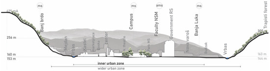 In compact cities, walking, cycling, and mass use of public transport are promoted with the aim of reducing air pollution and making more efficient use of energy, requiring a high-quality development plan. As another benefit of a compact city, the greater possibility of social interaction is often highlighted, given the concentration of a large number of residents in a relatively small area. Numerous studies on the effectiveness of this type of urbanization have been conducted on examples of cities around the world and have produced very different results. Increasing the density of the existing built structures contributes to a reduction in energy consumed in traffic, which is necessary for the functioning of new parts of the city. In this sense, well-organized public transport and alternative modes of transport are also important. By increasing the built-up area, the total need for energy in the city is also reduced through the choice of a building type because the energy consumption of a residential unit in a multi-apartment building is significantly lower than that of residential units in free-standing family houses. In the planning process, the elements of locating settlements and buildings (terrain configuration, terrain slope, available infrastructure, etc.) as well as microclimate (wind speed and direction, sunlight, air pollution) and green structures are considered because they are directly or indirectly related to energy consumption. Some of the goals set in the urban planning of Banjaluka are somewhere in between these compact city principles and recognized values and natural potentials for the preservation of a green city: reconstruction and densification of the center of the narrow urban area; arrangement of the banks of the Vrbas and Vrbanja rivers [22] into attractive green and recreational zones [25]; utilization of existing unused buildings and areas as renovated areas for attractive buildings and contents [19,20,21]; and densification of residential construction in the city center by transforming blocks of family housing into mixed blocks [20]. More research is needed on how dense urban neighborhoods incorporate green open areas. These spaces may not always be publicly available, visible, private, or public. Shared green spaces are increasingly prevalent in high-density residential areas due to the large proportion of apartments with limited opportunities to use green space within the block. Where there are opportunities for the formation of green structures, e.g., in the form of green roofs and balconies, there is a need for empirical evidence to examine the actual impact they have not only on cooling during heat waves but also on residents, property values, and biodiversity habitats. There are a growing number of research papers and urban policies on the concept of “green infrastructure” [3]. The development of green infrastructure and its research and development projects vary widely from country to country [12]. In a time of big global issues and a multitude of universal solutions, it is of great importance to understand the local specificities of spatial planning, recognize and prove favorable solutions, and protect and apply systems that are resistant to climate change.