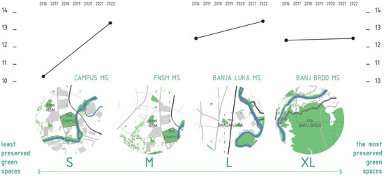 In 2020, the city of Banja Luka adopted the Action Plan for a Green City, with the goal of improving the ecological situation in Banja Luka in an efficient and financially sustainable manner with maximum benefits for the economy and society. The vision of the city sets a broad course for the green transformation of Banja Luka. The strategic goals that relate directly to green areas in this document are in the same direction: (1) reduce the uncontrolled expansion of the city; and (2) increase the volume, quality, and diversity of green areas and other green infrastructure [24]. In the case of uncontrolled expansion of the city, when it comes to Banja Luka, we have the example of a dispersed city as a model of the expansion of urban areas in the most unfavorable way in terms of sustainability. The expansion of the city, which implies low building densities, results in a number of unfavorable impacts on the natural environment. These are primarily high energy consumption and the constant expansion and occupation of new areas (very often agricultural land). The expansion of the city in this case requires greater investments in the accompanying infrastructure—traffic and communal. Large spatial distances arise that must be overcome in order to satisfy basic life needs other than housing (work, trade, education, culture, etc.). We ignore the fact that it is possible to make large energy savings through the very process of spatial and urban planning by harmonizing the interests of different users in space with the aim of sustainable development. In strategically attractive and high-quality areas of the traditional city center and the wider city center (vacant areas, complexes of abandoned factories, barracks, etc.), neoliberal capital sees an opportunity to create a new urban-architectural resource [38]. The University Campus, represents the largest organized green area for the city itself, and its position in the narrower urban area plays a significant role in cooling. In order to answer the question of the role of such a green structure in the city’s urban area, the measured temperature values were compared for the year 2022. In the annual report of the Hydrometeorological Institute of the Republic of Srpska, the year 2022 was listed as the warmest in the period since the measurements were taken, and during the year, 70 days with temperatures above 30 degrees Celsius were recorded [36].