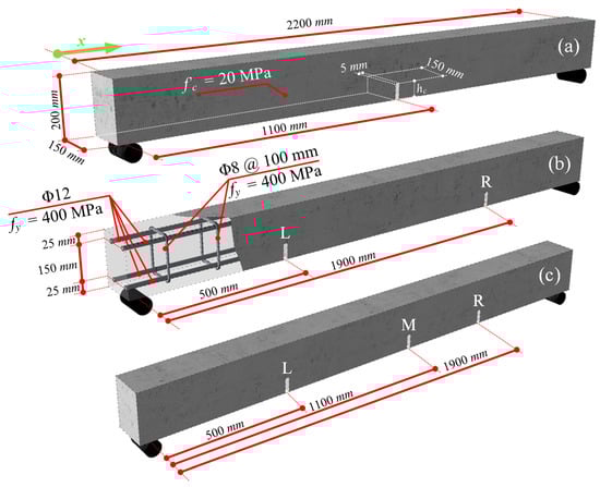 The geometrical and mechanical properties of the RC beam numerical model, including different damage scenarios perpendicular to the x-axis: (a) single, (b) double, and (c) triple.