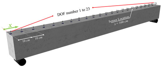 As illustrated in Figure 2, the degrees of freedom (DOFs) were arranged uniformly at intervals of 100 mm, in accordance with the modal tests performed during the experiment. Consequently, the numerical model of the selected RC beam comprised a total of 23 DOFs.