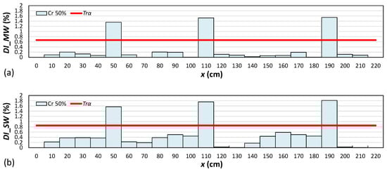 A sample of applying the threshold value (Trα) on damage indices: (a) DI_MW and (b) DI_SW.