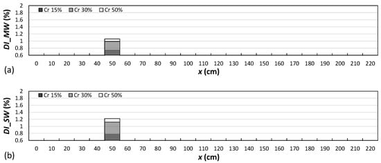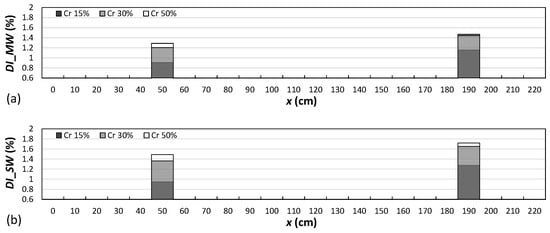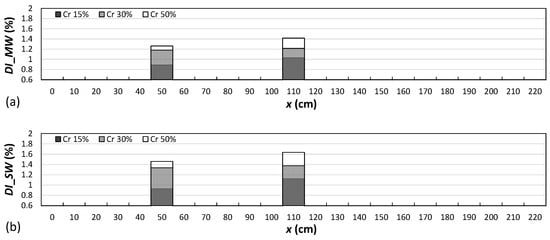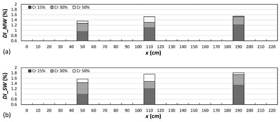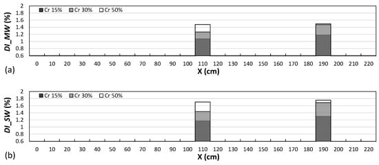 Additionally, the DI_SW damage index exhibited greater differences and higher accuracy compared to the DI_MW damage index for all damage scenarios. This observation suggests that the DI_SW index is more effective in detecting damage. Moreover, it can be observed that as the crack depth ratios increased from Cr 15% to Cr 30% to Cr 50%, the damage indices values increased as well, suggesting that the proposed damage indices can effectively ascertain the severities of cracks in double-damage scenarios.