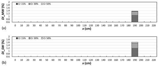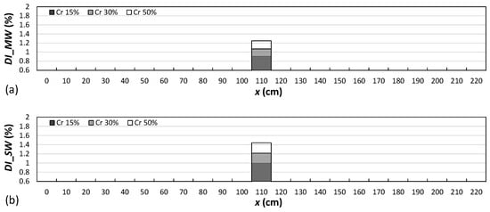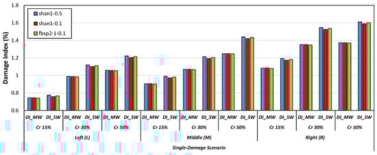 Figure 12 shows a comparison of the damage severities for a single-damage scenario in the proposed damage indices. The damage scenario considered was single cracks with depth ratios of Cr 15%, Cr 30%, and Cr 50% located at the left (L), middle (M), and right (R) sides of the RC beam. The presented results in Figure 12 show that both damage indices can detect the location of the left, middle, and right cracks, and their values increased as the crack depth of the damage scenarios increases from Cr 15% to Cr 50% which can be considered as a severity detection ability for the proposed indices. Moreover, DI_SW using the shan1-0.5 obtained higher values for all damage scenarios compared to DI_MW and the other mother wavelets. Furthermore, as the attached sensor location to the RC beam (x = 1900 mm) was near the considered location of the right-side cracks (x = 1600 mm) in comparison to the location of the left-side (x = 500 mm) and middle-side (x = 1100 mm) cracks, near the placement of the sensor with respect to the damage locations, it causes higher values of acceleration, and as a result, the values of the proposed damage indices for the right-side cracks were greater than the corresponding values for the middle and left-sided cracks.