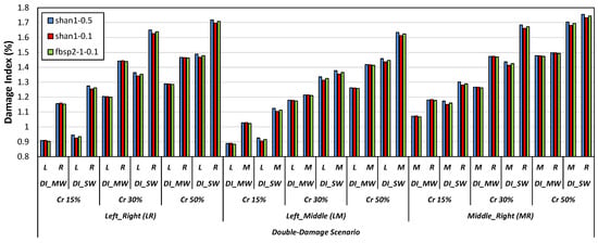 Figure 13 shows the comparison of damage severities for double-damage scenarios using the suggested DI_MW and DI_SW damage indices. The considered damage scenarios included double cracks with depth ratios of Cr 15%, Cr 30%, and Cr 50% located at the LR, LM, and MR of the RC beam. The results depicted in Figure 13 demonstrate that similar to the single-damage scenario, the shan1-0.5 mother wavelet exhibited the highest sensitivity in detecting double-damage scenarios. It was followed by the shan1-0.1 and fbsp2-1-0.1 mother wavelets.