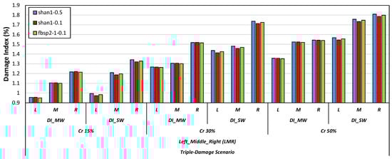 Figure 14 presents a comparative analysis of the proposed damage indices in identifying the triple-damage scenario consisting of cracks located simultaneously at the left, middle, and right (LMR) sides of the RC beam, with the same depths of Cr 15%, Cr 30%, and Cr 50%. The analysis was conducted using three different mother wavelets, shan1-0.5, shan1-0.1, and fbsp2-1-0.1, and comparing the results obtained from the DI_MW and DI_SW damage indices. The results in Figure 14 reveal that both damage indices can successfully detect the damage scenarios, and their values increased in proportion to the crack depths. Moreover, as the same outcome driven from the single- and double-damage scenarios, in the triple-damage scenario, the proposed damage index DI_SW using the shan1-0.5 mother wavelet demonstrated higher sensitivity in detecting damage scenarios than the proposed damage index DI_MW and other mother wavelets.