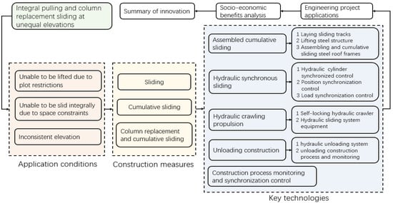 The theoretical research in this field focuses on the development of integral pulling and accumulating column replacement sliding construction technology for steel structures at uneven elevations. Its primary goal is to investigate the structural response of large steel structures with unequal heights and analyze the mechanical properties of segmental cumulative assembly, partial column replacement, and integral pulling and sliding for such structures. Additionally, an engineering practice analysis aims to develop construction technologies that utilize integral pulling and cumulating column replacement sliding for uneven-height planes. These technologies can be extended and applied in mountainous areas or locations with uneven ground levels. A technology roadmap depicting the proposed process is illustrated in Figure 2. The key technologies involved the integration of assembled cumulative sliding, hydraulic synchronized sliding, hydraulic crawler propulsion, unloading construction, and computer process monitoring and synchronization control. The main processes of the assembled cumulative sliding technology involve laying sliding tracks, lifting the steel structure onto the roof, and assembling cumulative sliding steel roof frames in sections. The hydraulic synchronized sliding focuses synchronized control on the hydraulic cylinder, position, and land. The hydraulic crawler propulsion technique uses a self-locking hydraulic crawler as driving equipment for a hydraulic sliding system. Unloading construction considers the hydraulic unloading system and the unloading construction process.