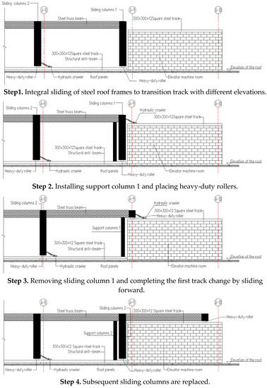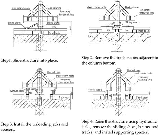 The fundamental principle of the integrated tension-cumulative sliding roof construction technology addresses the challenge posed by varying roof elevations, rendering traditional lifting and sliding methods inapplicable to the steel roof truss [15,16]. To overcome this, the truss is initially slid to the junction position between the high and low spans. Subsequently, strategically positioned temporary support columns serve two primary purposes: supporting the top beam and replacing the original sliding columns. With the steel roof truss raised or lowered, sequential sliding operations can smoothly proceed to subsequent steps. Figure 5 illustrates the detailed operations of column replacement for the top beam, which include the following steps: