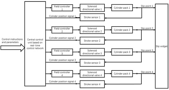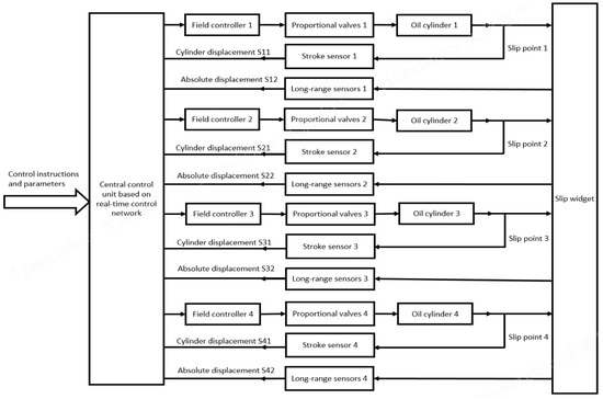 Load synchronization control plays a crucial role in maintaining a minimal deviation between the actual load and the theoretical load at the slip points. To achieve this objective, real-time monitoring of the sliding point’s position is essential, accompanied by the implementation of a load synchronization control scheme. Load synchronization control is implemented to maintain the synchronized position of the steel roof truss during the sliding process. When performing the sliding operation on the sliding track, a master sliding point should be designated, while other points are set as follower points. To ensure that the displacement difference between them is not significant, a speed control valve can be used in the hydraulic system for synchronization. The speed control valve has a load compensation function, which maintains the same pressure drop across the two throttle orifices. However, due to factors such as hydraulic forces and resetting springs, as well as the inherent inability to achieve absolute equality in the throttle orifices, the synchronization error of the speed control valve is generally around 5%. Furthermore, the system must be a constant-pressure system, resulting in both overflow losses and pressure losses. The control box, responsible for executing the load synchronization control strategy, is depicted in Figure 8.
