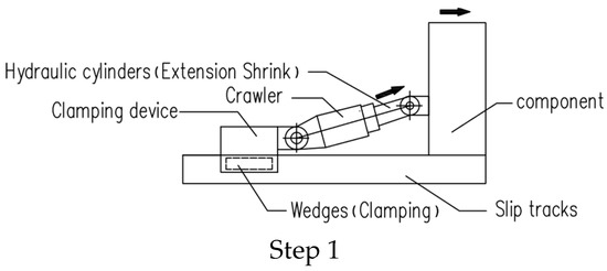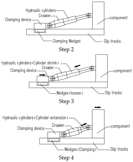 The hydraulic synchronized sliding technique employs a self-locking hydraulic crawler as the driving equipment. The self-locking hydraulic crawler is a combination structure with wedge-shaped clamps that provide a one-way self-locking action. The control of the sliding track’s retraction and driving is achieved through the extension and retraction of hydraulic cylinders. When the cylinders extend, the clamps tighten, securing the sliding track. Conversely, when the cylinders retract, the clamps loosen and move in the same direction as the cylinders, facilitating the sliding motion. The advantages of the self-locking hydraulic crawler lie in its ease of synchronous control with the sliding track, time and labor efficiency, elimination of the need for a counterforce frame, and high positioning accuracy. The working diagram of the crawler is illustrated in Figure 9. The crawler operates in the following steps: