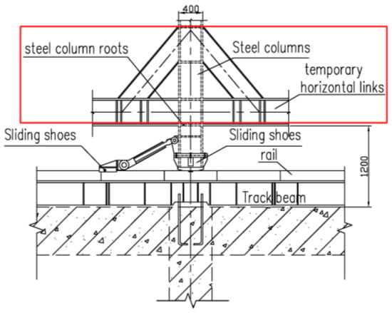 During the cumulative sliding installation process, the jacking point of the hydraulic crawler is strategically positioned at the lower steel column’s bearing location. To ensure structural stability and safety, steel sliders are installed at the support of the lower steel column along the main joist. However, due to the absence of horizontal force transmission components between adjacent steel columns in the sliding direction, substantial thrust and friction arise during the sliding process, resulting in an undesirable additional moment around the root of the steel column. To address this issue, temporary horizontal links are established between each adjacent pair of steel sliders (i.e., steel column roots) along the track direction. These horizontal links enable the sequential transmission of the hydraulic jacking equipment’s horizontal traction force from the front to the rear steel sliders, thereby ensuring the stability and controlled sliding of the steel roof frame (see Figure 10).