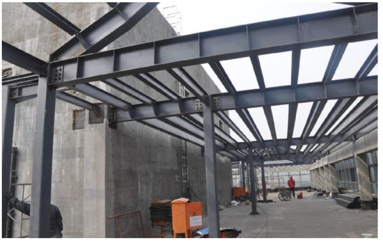 In recent years, the use of steel structures in the construction of large public buildings has become increasingly popular due to their excellent seismic performance, lightweight nature, and high strength [1,2,3,4]. To meet the lighting requirements of such buildings, light-transmitting materials like glass are often incorporated into oversized steel structures situated atop them (see Figure 1).