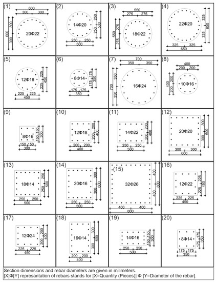 A set of reinforced concrete column cross-sections.