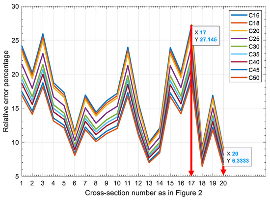 Figure 6 shows the relative improvement percentage change depending on the concrete quality with respect to the cross-sectional area. According to the proposed methodology in this paper, the least error percentage is with section number 20 coupled with concrete quality C50. The maximum relative improvement percentage is with the cross-section area in number 17 (slightly rectangular) and associated with concrete quality C16. Comparison of this last figure with the previous one indicates the same minimum and maximum equivalent elastic modulus for the same cross-sectional and concrete quality categories.