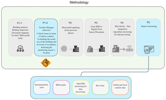 As shown in Figure 1, the proposed methodology is divided into six main tasks: building analysis; BIM updating; thermal comfort assessment; sensor placement; BIM–sensor data integration; report organization.