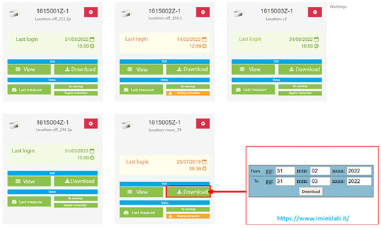 The microclimate station and the data logger shown in Figure 2 acquire the measurements every 10 min. They transmit the data to the platform every 30 min. These settings were made during the installation of the control units inside the building.