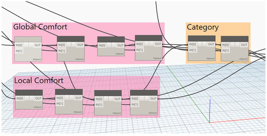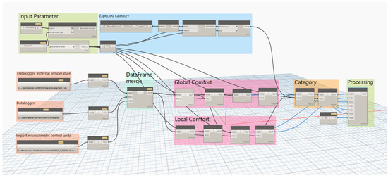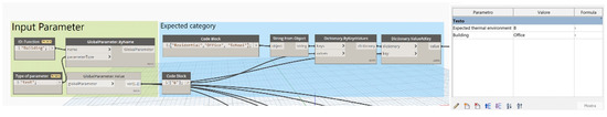 The proposed procedure creates the dynamic process of integrating data from the BIM and monitoring systems. The input data (room use, comfort category) for the algorithm are read from the BIM of the building, through nodes called “Input Parameter”. With the “Expected Category” group of nodes, the algorithm can identify the expected category for each room, again according to [13], as shown in Figure 5.