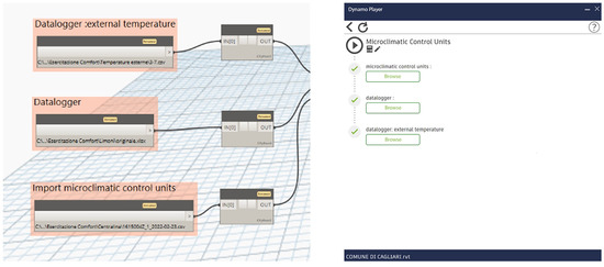 The operation of recording, uploading, and processing microclimatic parameters requires considerable computation time. The workflow in Figure 4, developed in Dynamo, enables more efficient and faster data management from microclimatic stations. An operator can start the script through Dynamo Sunbox or the interface defined as “Dynamo Player” in Revit.