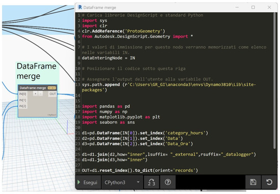 As microclimatic stations must be moved to detect conditions in different parts of the building, the start and end of monitoring must be written down manually. Often, the transcription is carried out on a paper document. A new node is introduced to overcome this criticality. The new node can automatically find the shared time value between the three data frames imported from the dataloggers and the microclimatic controllers. The node named “Data Frame merge” automatically detects the start and end of monitoring. As indicated in Figure 7, the integration of Python into Dynamo makes this task possible. Python allows the exploitation of rich open-source libraries through integration with Anaconda (Python’s distribution platform), which were also used to calculate PMV and local comfort indexes and to create the graphs presented in the report.
