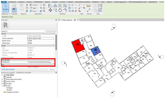 In this task, the as-built BIM provided by the facility manager has been updated and integrated with the information collected in the previous task: the actual type of activity carried out, areas, and occupancy levels of users. It will also be essential to integrate BIM with all the necessary documents for the subsequent task of choosing and placing the sensor network. The creation of a virtual model for the sensors located inside the building was not considered necessary. It was considered much faster as well as more sustainable to associate the monitoring data with the “room” object of BIM. It is nothing more than a “smart object” to which a variety of data and information, including data from sensors, can be linked. The “room” object is a space delimited by the virtual objects of BIM such as walls, floors, and ceilings. With this type of “object”, various data and information such as constraints, dimensions (area, volume, and perimeter), number, name, destination, occupancy level, etc., will be associated. The “virtual” room must be named with the same code as the “real” room. Finally, it will be associated with the “room” object the parameters needed to collect comfort data from the sensor network used to monitor indoor comfort conditions. They must be able to create a “bridge” between the monitoring system and BIM.