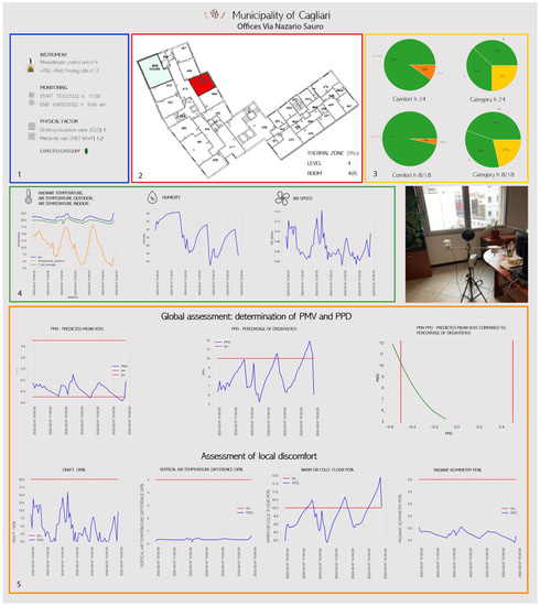 Section 1 of Figure 11 provides information on the instrumentation used and on the start and end date and time of the monitoring. Furthermore, values for clothing insulation, metabolic rate, and information on the expected category are reported, as indicated in blue box 1 of Figure 11.