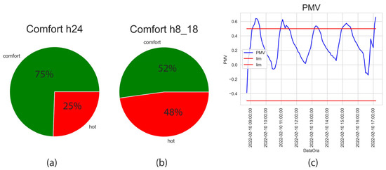 Thermal condition: (a) comfort during the day, (b) comfort during office hours, (c) PMV.