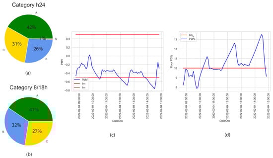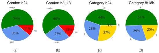 Thermal condition: (a) comfort during the day, (b) comfort during office hours, (c) category during the day, (d) category during office hours.