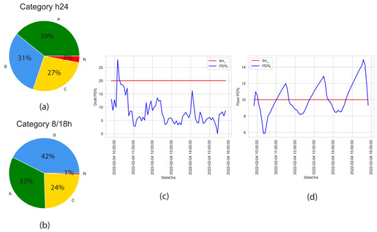 Thermal condition: (a) category during the day, (b) category during office hours, (c) draft, (d) local discomfort—PD% caused by warm or cold floor.