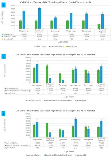 Figure 3. Growth rates and cell culture density compared to the initial culture density per strain. (a) Cell culture density of the activated cultures of the different algal strains after 4 weeks of cultivating each strain in its optimum growth media and conditions, compared to the starter culture density per strain. (b) The estimated cell culture density per each immobilized algal strain on the bioreceptive tile P1, in comparison to the inoculum (activated) culture density per strain. (c) The estimated culture density per each immobilized algal strain on the bioreceptive tile P2, in comparison to the inoculum culture density per strain.