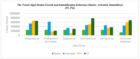 Figure 6. Analysis of the tested algal strains’ growth and immobilization behavior including the starter or initial culture, the activated culture, and the differential immobilization culture densities on each bioreceptive tile separately, P1 and P2.