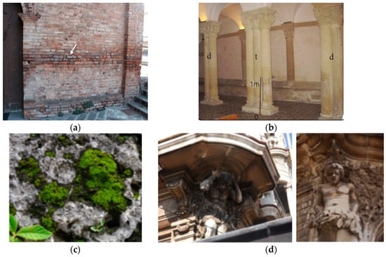 Views of damage to historical masonry structures due to (a) capillarity [], (b) moisture [], (c) moss formation [], and (d) black crust action [].