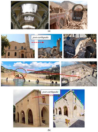 Many historical structures were erected with stone/brick and mortar using masonry methods, which was a common construction method in ancient times. Masonry structures consist of only a few materials, namely stone, brick, timber block, mortar, etc., and their structural behavior is quite complex. Climatic factors (extremely high or low temperatures, windstorms with high wind speeds, significant precipitation) can cause significant damage and deterioration in the integrity of historical structures or their elements. In masonry structures, there are secondary elements (tie beam, beam, etc.), which are built of wooden or metal materials. These parts may expand or shrink due to temperature differences, and this may result in cracks in the masonry elements. Natural stones can erode over time, and they can be seriously damaged due to the freeze–thaw effect. The rise in groundwater in the masonry walls and the capillary effect can also cause efflorescence in the masonry units, and this results in deterioration of the physical and chemical structure (Figure 1a) [,]. In addition, moisture has a negative effect on historical structures. It leads to bad smells, wetness on the walls, efflorescence, moss formations, and so on (Figure 1b) [,]. Walls close to the soil in a constantly humid environment can be exposed to moss formation with the effect of water rising from the foundation or environmental conditions formation (Figure 1c) [,]. Air pollution is another adverse effect for masonry elements. Stone surfaces that are not exposed to rainwater may turn black over time, and their authenticity and integrity may be affected by the crust cover formed (Figure 1d) [,]. Moreover, there are significant threats from a wide range of destructive actions such as earthquakes, floods, cyclones, vandalism, and soil settlement [,,,,,,,,]. Some images of damage caused by some of these destructive actions are shown in Figure 2. In particular, one of the most serious threats to historical structures is earthquakes, which have many unknown parameters, such as occurrence location, time, magnitude, and so on.