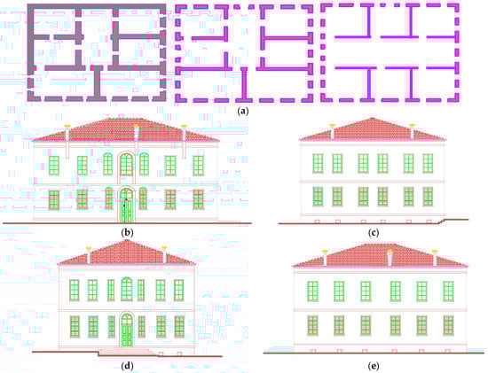 Views of the drawings: (a) plan views, (b) front facade, (c) left facade, (d) right facade, and (e) back facade.