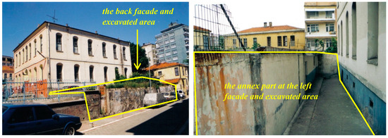 The historical masonry building in the province of Samsun (Figure 4), on the north coast of Turkey, dated back to the 1870s. The building was erected for different purposes. At the beginning of its history, the ground floor was used as an infirmary and the first floor was used as a dormitory. Late in the 20th century, it was being used as a school building. In the 1970s, a fire caused damage to the building, and then the damaged parts were rebuilt. The building has a rectangular plan (Figure 5) and consists of three storeys with a height of 2.64 m for the first, 4.26 m for the second, and 4.59 m for the third. The building was constructed according to the traditional masonry technique, using clay bricks. The inner walls at the third story were built using a timber frame system and plastered with timber laths. Also, the first storey (basement) was constructed by using rubble stone masonry and clay brick masonry walls. The thickness of the wall in the basement is approximately 0.7 m. The masonry walls at the upper parts vary in thickness from 0.45 to 0.60 m. The slab and roof systems were erected using timber elements. In 2020, it was decided to repair and strengthen the building due to damage to the masonry walls. The following were the reasons for the damage: the backyard ground of the building was excavated up to the foundation level for the parking facilities; the additional part at the left facade of the building was removed, and this area was excavated close to foundation level (Figure 6). These excavations caused the different soil settlements, slips, and deformations in the foundation system, and this resulted in damage to the building. Figure 7 shows the schematic views of the damage observed in the building. As can be seen, no damage to the walls at the right facade was propagated. The damage to the building occurred at the front, left, and back facades of the building. Figure 8 shows the cracks that occurred on the load-bearing walls of the building. It is well known that the most common sign of settlement crack is the cracks on the walls appearing in the form of diagonal or incline tension cracks. They are usually found around the edges of buildings and openings (doors and windows). As can be seen in Figure 8, the crack patterns indicate the presence of settlement beneath the building.